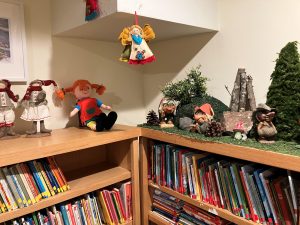 Our children’s library is a cozy space downstairs, decorated with trolls and many picture books in both English and the five Nordic languages. We have signs directing you there, but any of the librarians in our main library (next to the front desk) would be happy to show you the way.